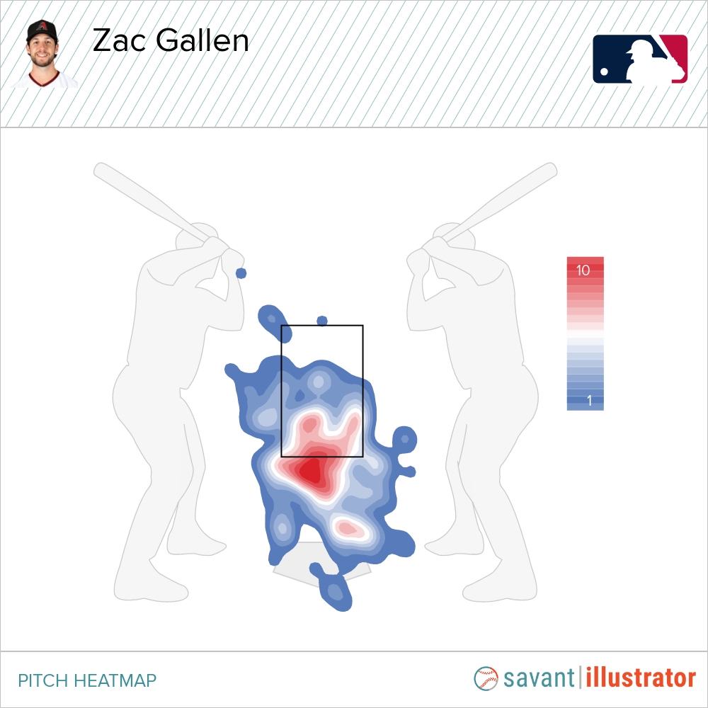 With both of his fastballs, Gallen was heavily targeting them to his glove side. There is a “hot spot” for the cutter down and to the glove side on the chase, but notice how the fastballs are mostly clustered around the outer edge of the strikezone – giving visual confirmation to Gallen’s high Edge % from above – and how relatively few of them were aimed towards the upper edge of the strikezone and to Gallen’s arm side.