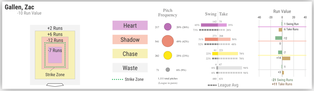 The swing rate against Gallen in the Shadow part of the zone was right in line with the league average: batters swung at 51% of the pitches Gallen threw in the Shadow, as compared to 52% for the league average. One observation that I think speaks to the deception of Gallen’s stuff is that hitters only swung at 65% of his pitches in the Heart of the zone, as opposed to 73% for the league average.