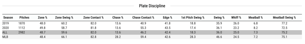 Cavan Biggio made his debut with the Blue Jays in 2019, and one thing he has done better than anyone in baseball since then, is not chase pitches out of the strike zone. His outside zone swing rate has been the same 13.6% in both 2019 and 2020 seasons.