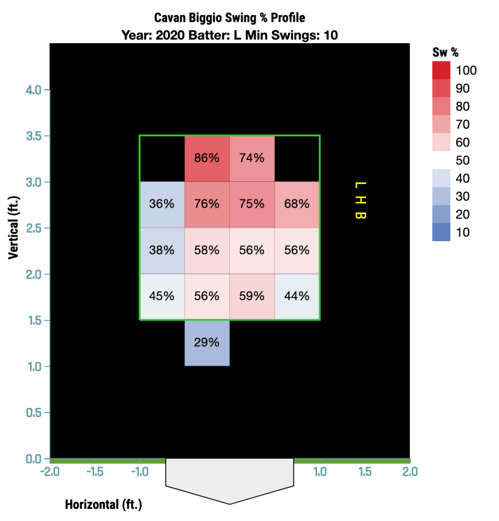 The other observation from the images above is that Biggio is less likely to swing at pitches away than a typical lefty MLB batter. In particular, at pitches that are about belt high. In 2019, MLB lefties swung at those pitches at a 57% rate in both the “waist-high and away” squares, while Biggio swung at 39 and 43 percent of pitches in those zones in 2019, and 36 and 38 percent in 2020.