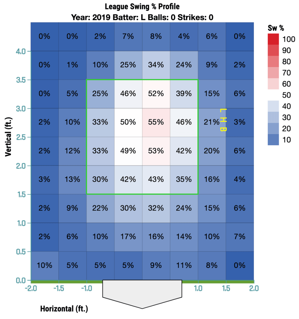 Let’s finish up by looking at Biggio’s first pitch swinging propensity, or lack thereof. Based on the analysis above, one would expect Biggio to be more aggressive on pitches on the inside and middle of the plate. Once again, I compared his first pitch swing tendencies with all the other left handed batters in the 2019 season.