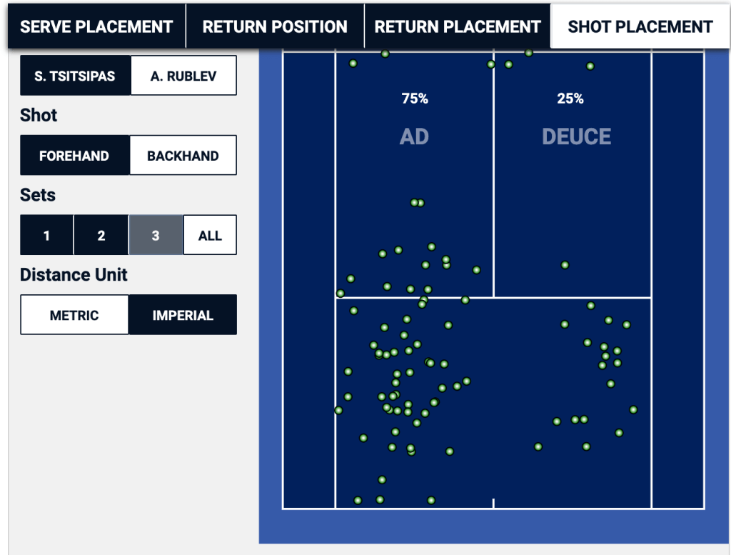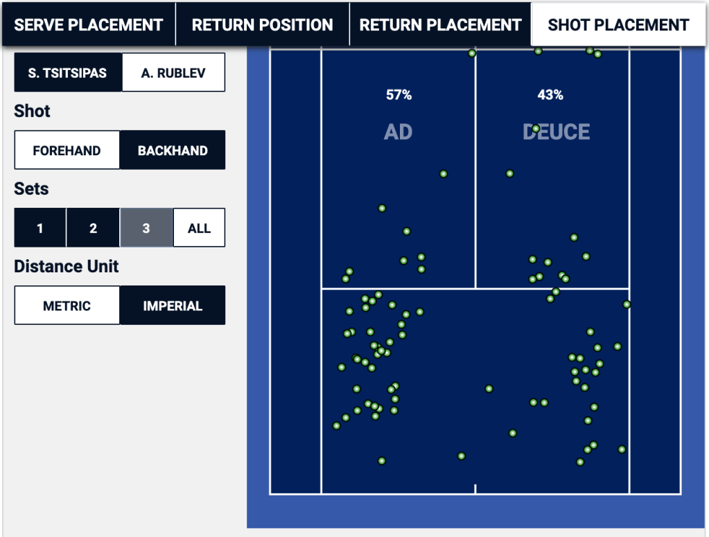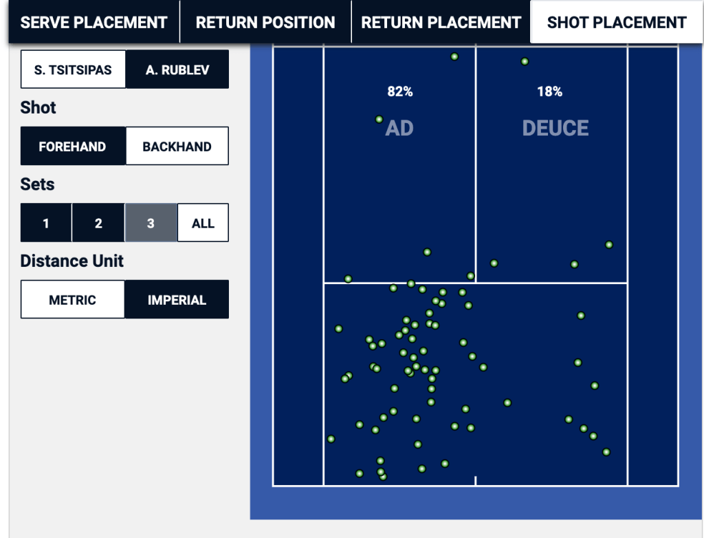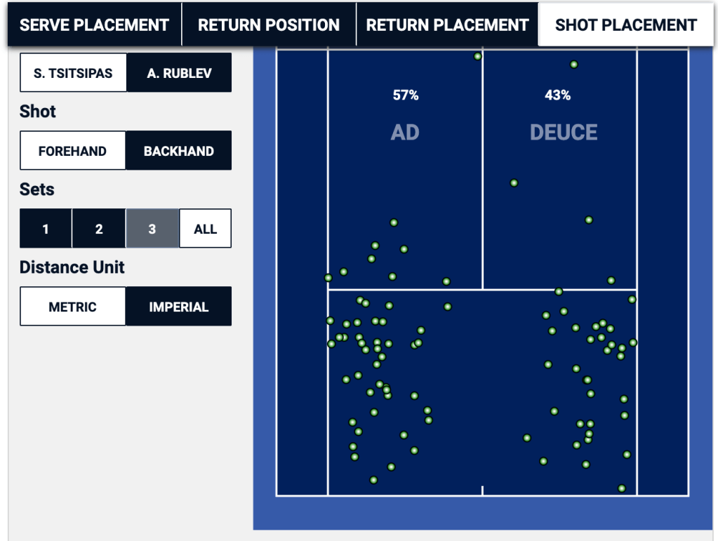 On the forehand side, both Rublev and Tsitsipas preferred to aim their forehand into their opponent’s backhand, but the split is much closer to 50-50 than it is for the backhands. Forehands are hit faster, with more spin, and placed more unpredictably than backhands. This reinforces the traditional view of the forehand as the “sword,” and the backhand as the “shield;” the men’s groundstroke game is really a battle for forehands. At the same time, I think a backhand down the line is a tremendous weapon in today’s men’s game to counter this strategy, but that is for another blog post.