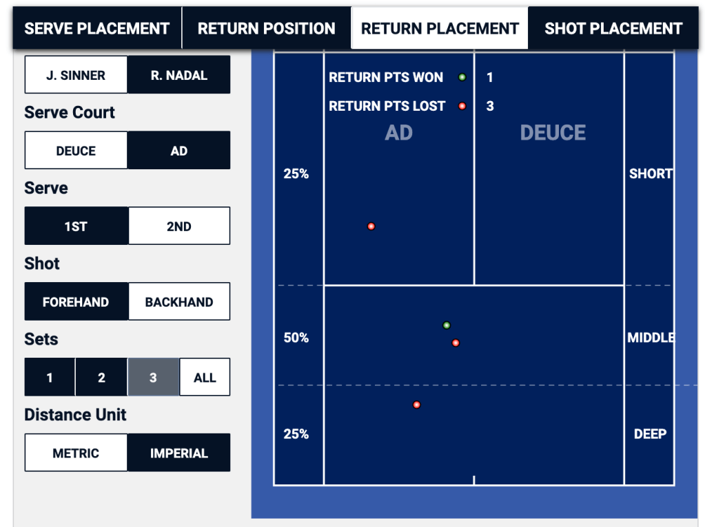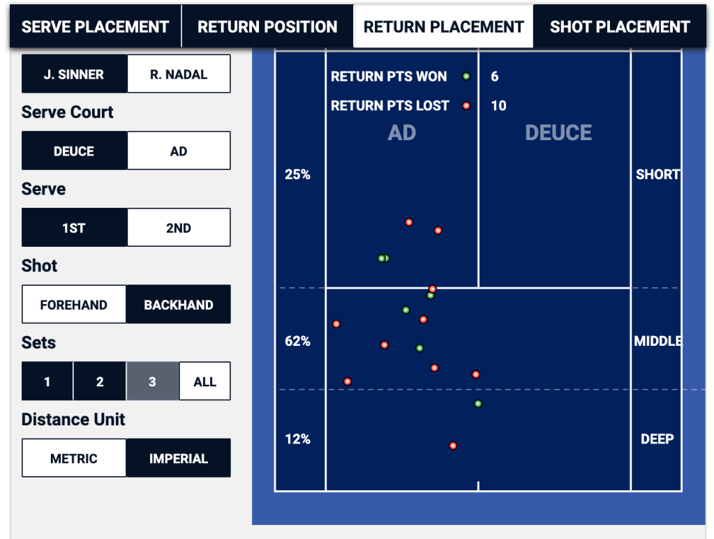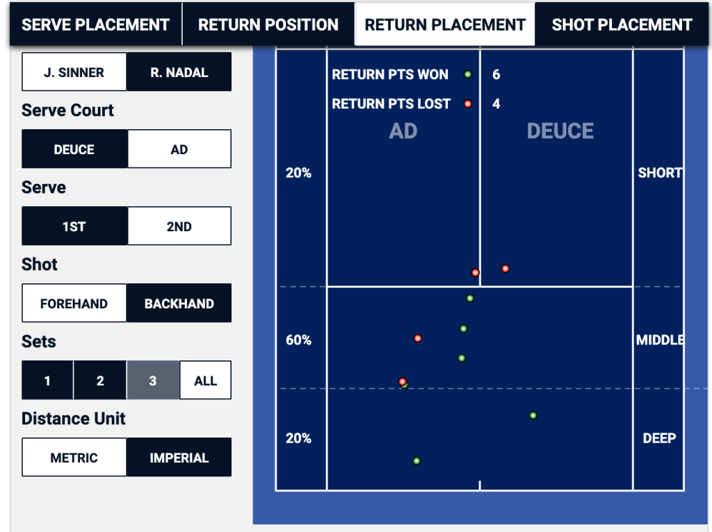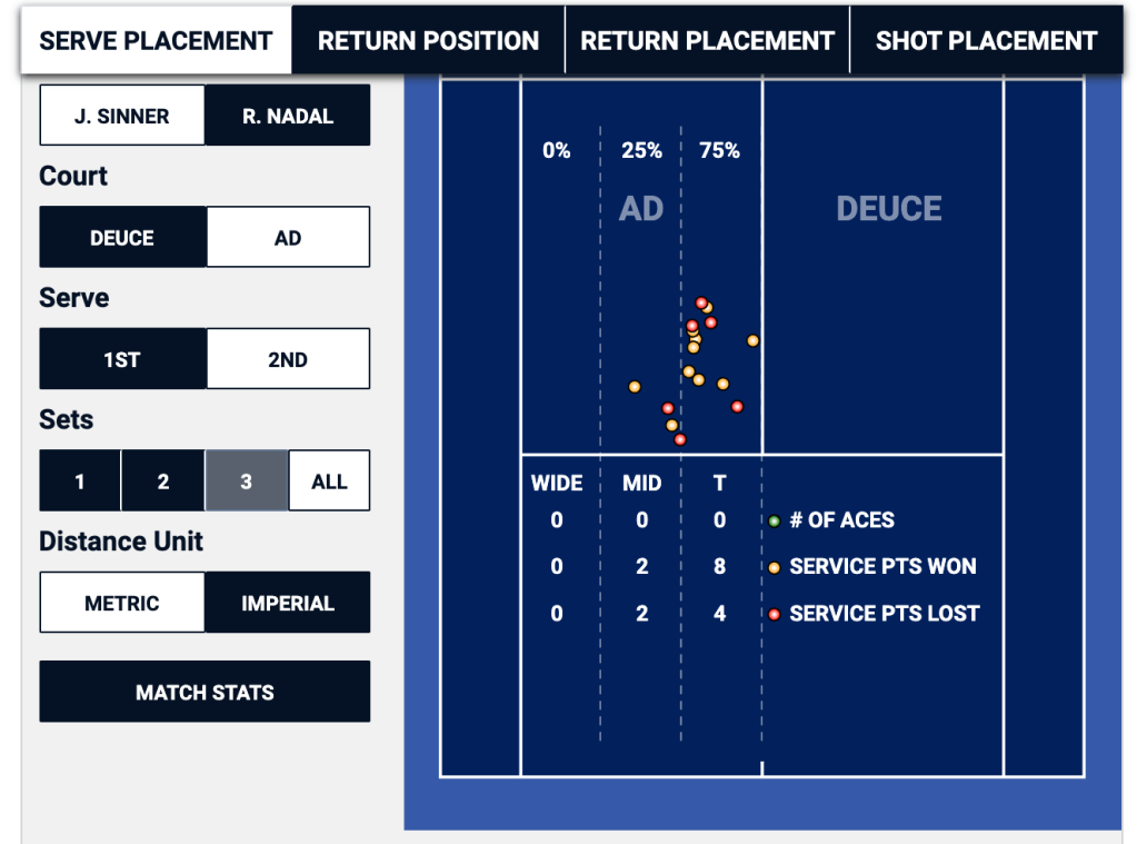 When Nadal is getting ready to return Sinner’s second serve, he can basically eliminate half of the service box in the deuce, and a third of the service box in the ad. In this particular match, it was a winning strategy for Sinner in the ad court, where he won two thirds of the points that started with his second serve down the “T”, but it was a losing proposition in the deuce side, where he lost two thirds of his second serve points that started out wide.