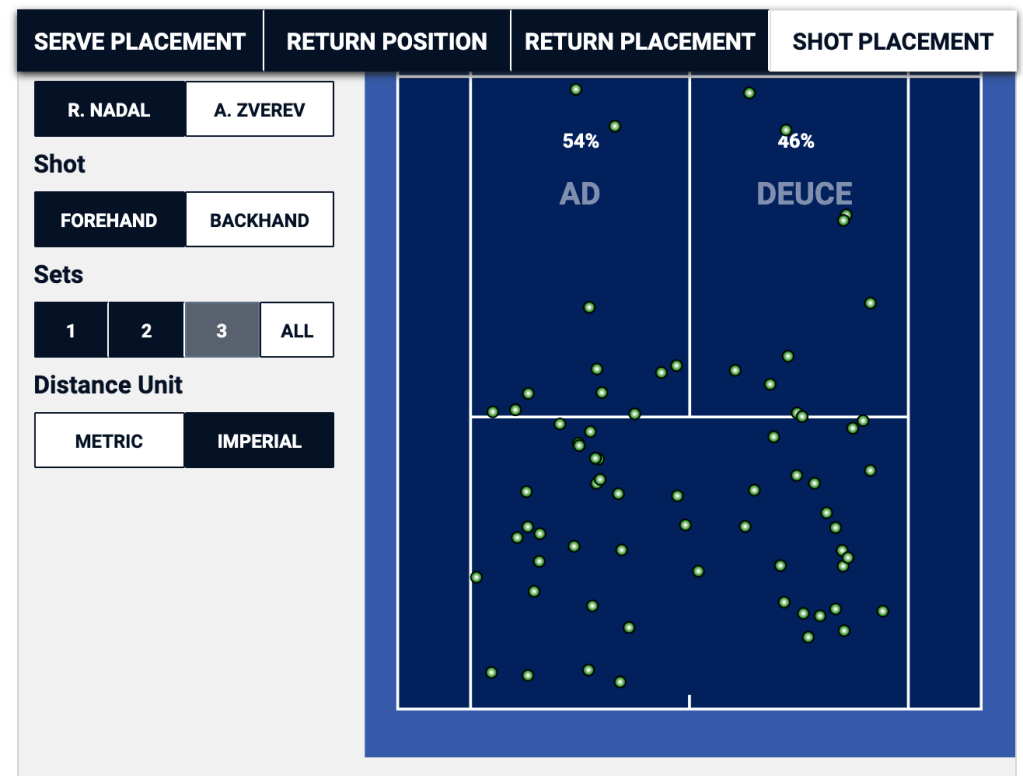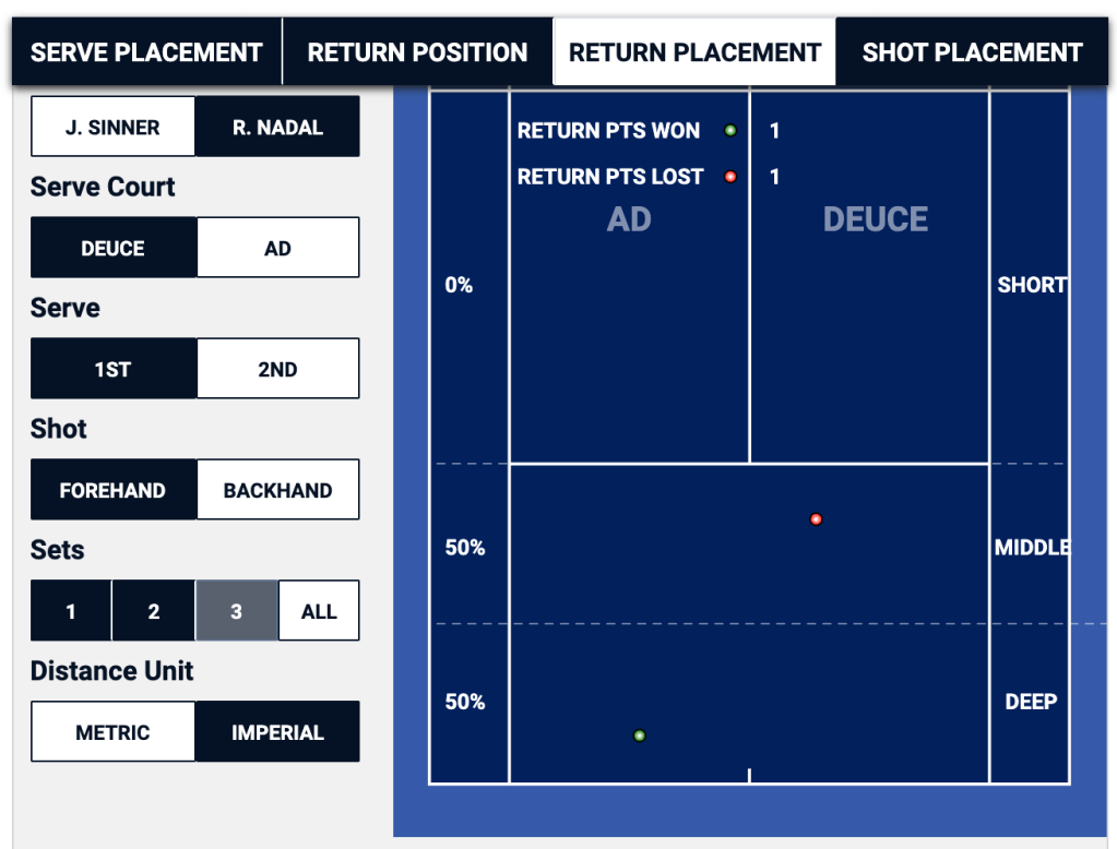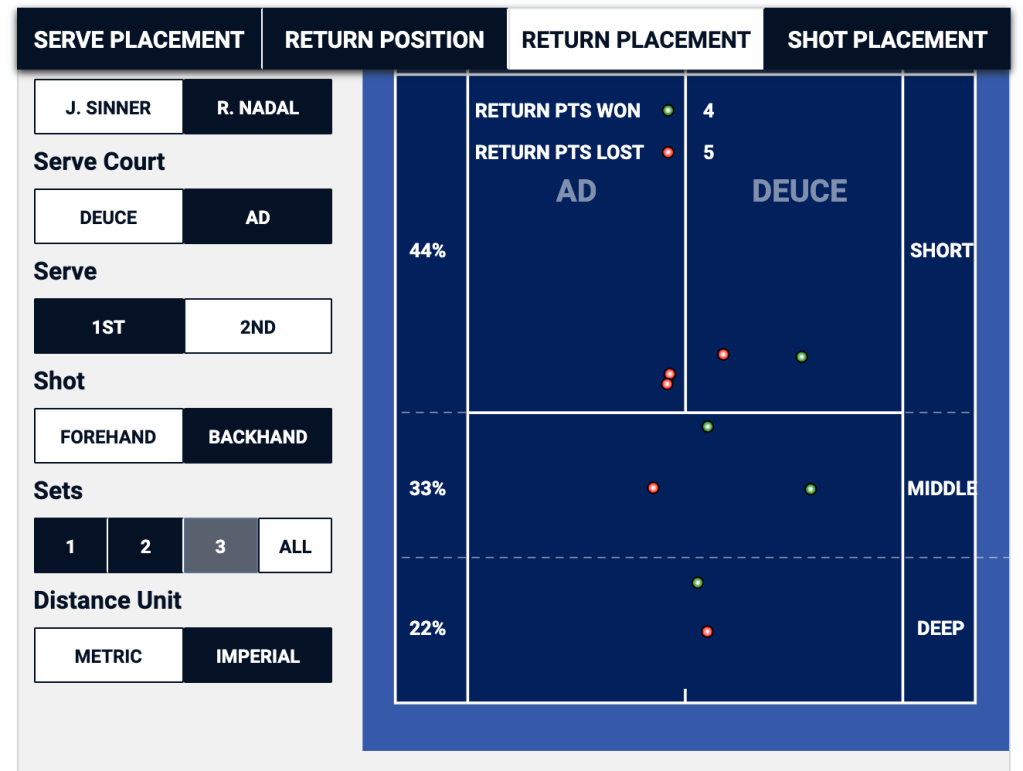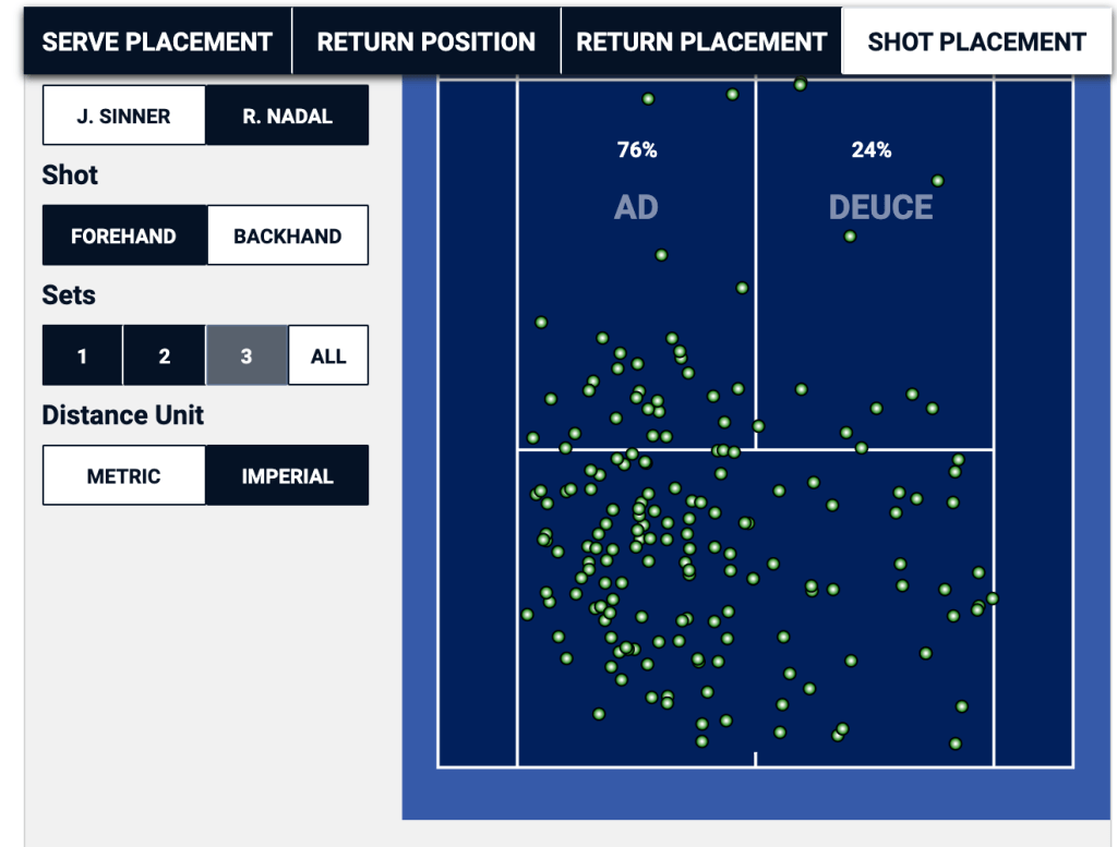 When Nadal is getting ready to return Sinner’s second serve, he can basically eliminate half of the service box in the deuce, and a third of the service box in the ad. In this particular match, it was a winning strategy for Sinner in the ad court, where he won two thirds of the points that started with his second serve down the “T”, but it was a losing proposition in the deuce side, where he lost two thirds of his second serve points that started out wide.