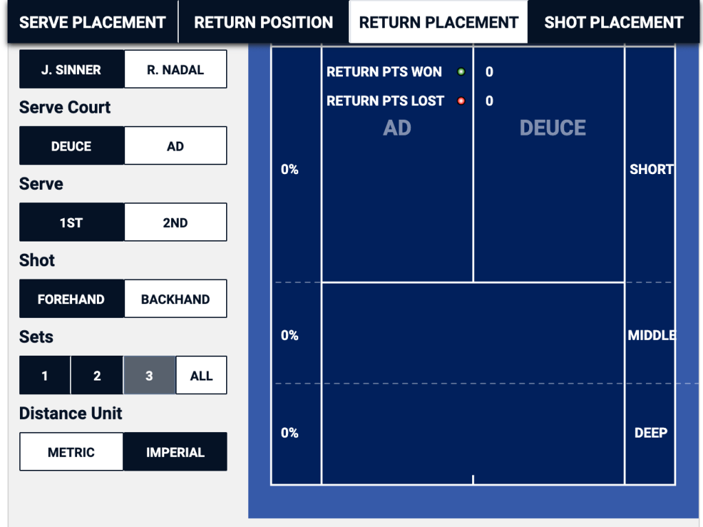 My biggest takeaway from this analysis would be for Sinner to hit more second serves out wide in the ad, but especially down the T in the deuce side next time he sees Nadal. It would prevent Nadal from zeroing in on one particular area of the service box, and Sinner has shown the ability to handle the Nadal forehand return by having a winning percentage against it in the ad side.