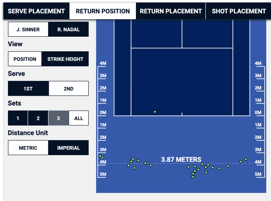 Sinner hit his second serve returns about 0.73 meters above the net. I’d like to see that number be closer to about 1 meter, if Sinner were to keep returning from way back behind the baseline. Just those additional 30 centimeters of net clearance would get the returns a bit deeper, and set up Sinner on offense at the start of the rally.