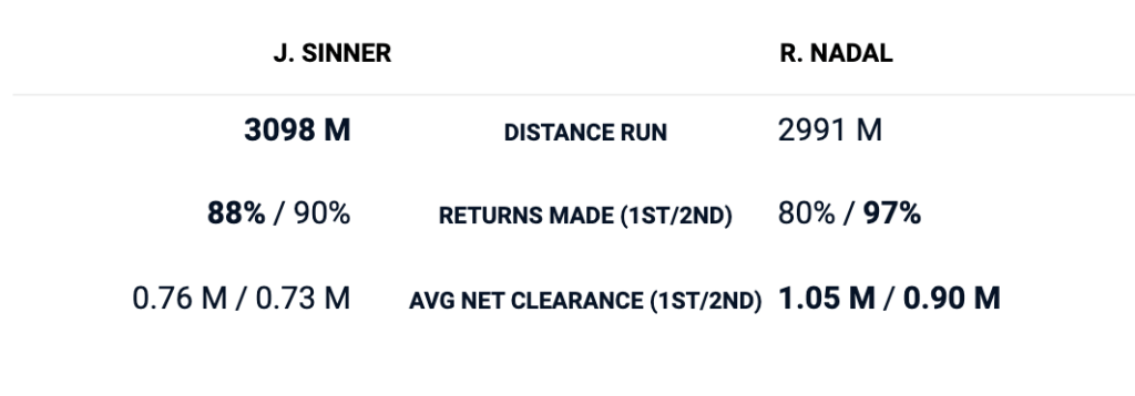 Let’s sum it up. Sinner was clearly targeting the Nadal backhand with his second serve in both sides of the court. He got as he wished in the deuce, and lost the majority of those points. He couldn’t find the Nadal backhand with the second serve in the ad, and won the majority of those points.