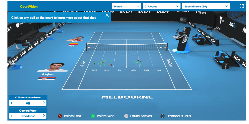 Alcaraz is 18 years old, and ranked #29 in the world as of January 31st, 2022. If you haven’t seen him play, he is far from your typical Spanish clay court specialist. His is a complete attacking game, with the power to dial up a first serve in the 130mph range, control the rallies with his massive forehand, but also transition to the net and hit the occasional drop shot . The scary thing for the rest of the professional tennis world is that at 18 years of age, Alcaraz can only get better. And one area, where Alcaraz can elevate his game, is his 2nd serve placement.