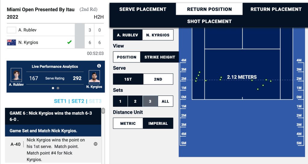In the round of 16 match, Kyrgios is set to face Jannik Sinner. I would assume that Kyrgios won’t be looking to engage in prolonged baseline exchanges in that match either. His second serve return positioning will give you a hint as to the quality of Sinner’s second serve, as well as the style of match that Kyrgios will want this to be.