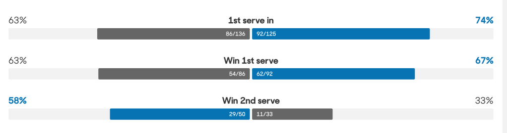 Alcaraz had the upper hand when the first serve was put in play, winning 67% of those points compared to 63% for Djokovic. But Alcaraz couldn’t get anything going behind his second serve, winning only 33% of the points, well below the 58% of Djokovic. Djokovic is one of the best returners in the history of our sport, but Alcaraz’ predictable second serve placement helped him out last night.